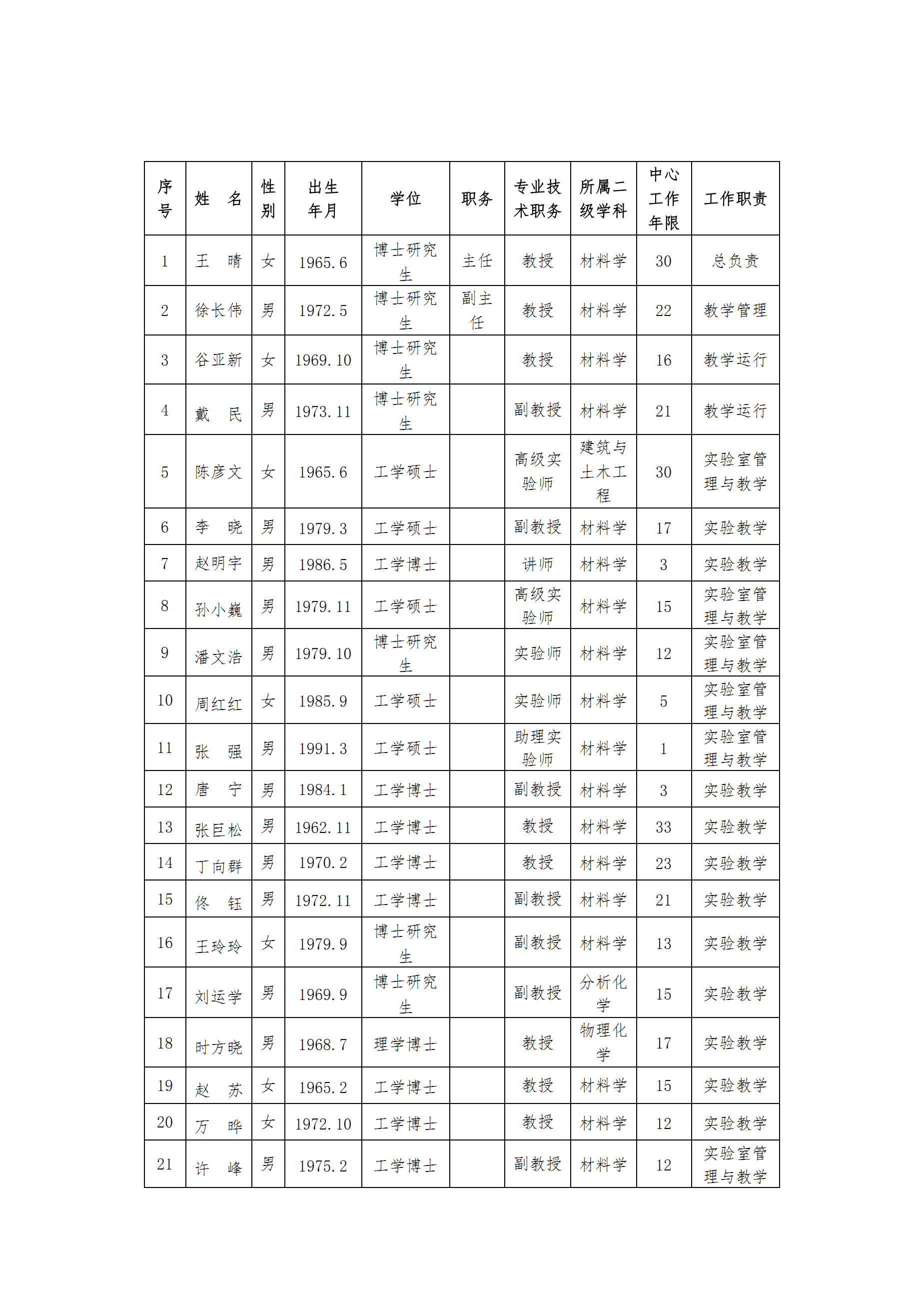 中心主任王晴教授为辽宁省“百干万人才工程”百人层次,省级教学名师,省级精品课负责人。担任国家教育部无机非金属材料工程专业教学指导委员会委员,辽宁省材料类教学指导委员会委员。围绕着中心主任,教学团队首先优化专业结构,提升学历层次,以7名专业主干课程主讲教师为主体,针对该专业应用性的特性,选聘实践指导师资,使团队师资搭配合理,专业互补,相得益彰。其次,强化梯队建设,注重能力素质互补。 通过培养和引进的方式,使教学团队在年龄上实现老中青结合,在职称上实现高中初匹配。逐步提高年轻教师在主干课程带头人中的比例。最后,完善运行机制,实施目标管理。经常开展课程的研讨和梳理工作,总结年度教学的成功经验和部分课程存在的不足。积极收集国内外同类课程的相关资料,将当代最先进的理论知识和学术成果融入教学内容,建立质量考核制度,将教师的科研开发能力和实际教学工作能力纳入教师考核指标体系。本专业教师非常重视教学工作,潜心教学研究,大力开展科研工作。 近五年来,高级职称教师中承担专业课或专业基础课教学工作比例为100%,教学效果好,促进了专业建设的发展。 本团队在多年的教学改革与实践中,已形成稳定的梯队,团队的职称和知识结构合理、发展目标明确、学科专业体系优势显著,并具有良好的敬业、合作精神。团队的教学效果、人才培养质量、科研水平、社会贡献以及在材料科学学科教育、研究、实践等方面达到国内先进水平。 具体情况详见下表。